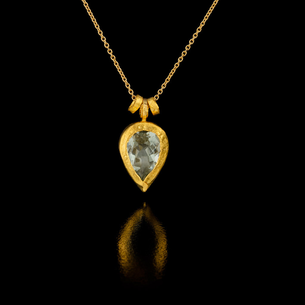 A delicate pendant featuring green Amethyst drop. The bright color of the stone interacts with the gold wrapping, creating a light and classic piece to wear on the neck on a daily basis.